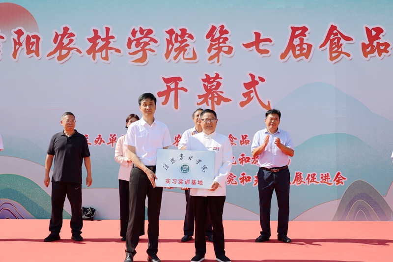 刘开华向信阳市渔味堂餐饮服务有限公司董事长郑权授牌“beat365在线平台官网实习实训基地”,并宣布beat365在线平台官网第七届食品文化节开幕。
