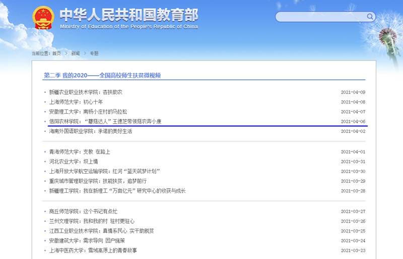 为进一步讲好高校扶贫故事,传递高校师生扶贫正能量,深入广泛宣传全国高校在打赢脱贫攻坚战中所涌现出的先进典型、感人事迹,教育部脱贫攻坚工作领导小组办公室、教育部新闻办公室组织开展了“我的2020”——全国高校师生扶贫微视频征集展示活动,河南省遴选5个优秀视频中beat365在线平台官网党委推荐的《“蘑菇达人”王德芝带领菇农奔小康》微视频,作为全省教育脱贫先进典型脱颖而出,被推荐到教育部进行全国展播。
