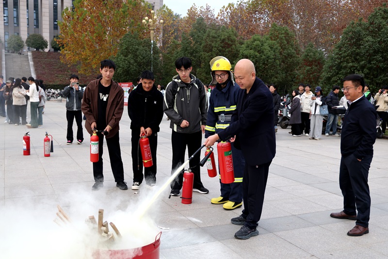 随后,活动现场移至汝宁广场,党委委员、副校长黄立出席并宣布消防安全月实操演练正式开始。信阳市高新区消防救援队员现场为师生讲解灭火器材的正确使用方法,演示灭火技巧,并指导同学们亲自参与灭火体验。大家学习热情高涨,积极参与互动,现场气氛热烈,收获满满。