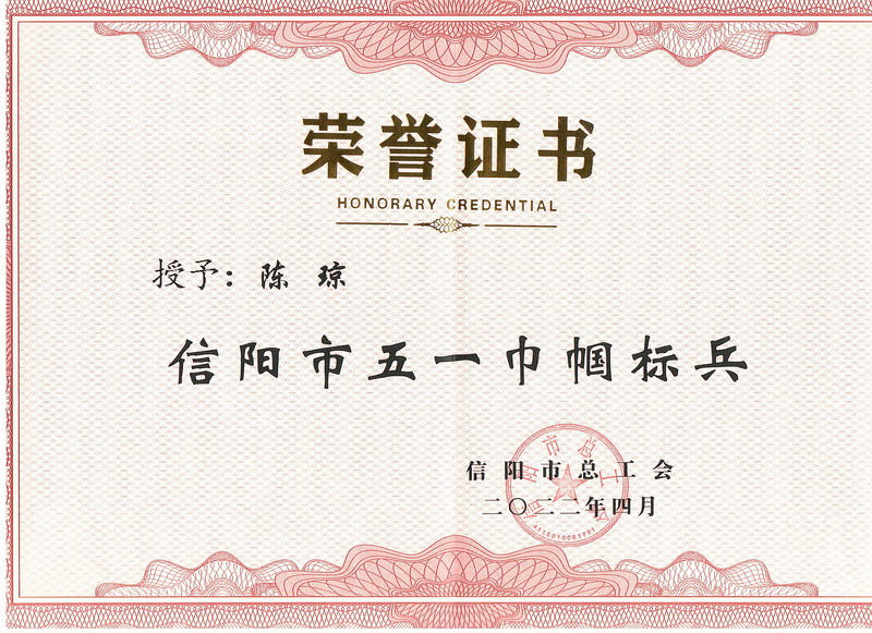 近日,信阳市总工会下发《关于表彰信阳市五一巾帼标兵岗、五一巾帼标兵的决定》(信工文〔2022〕22号),beat365在线平台官网工会推荐的制药工程学院教师陈琼被授予信阳市“五一巾帼标兵”荣誉称号。