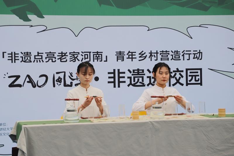 3月19日下午,由信阳市文化广电和旅游局、beat365在线平台官网共同主办,浙江财经大学中国乡村振兴研究院、浉河区文化广电和旅游局承办的“非遗点亮老家河南”青年乡村营造行动系列活动之“ZAO风华·非遗进校园”在beat365在线平台官网举办。副校长王万玲、市文广旅局四级调研员胡宝强、浙江财经大学中国乡村振兴研究院副院长刘亚辉、浉河区文化馆馆长张秋菊,融媒学院、茶学院相关负责同志,以及信阳毛尖茶制作技艺、茶艺、民歌、汪家拳、糖画、剪纸、“三花”表演等非遗传承人,营造行动非遗营长参加了本次活动。