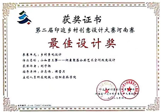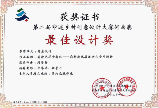 2023年4月27日,第二届印迹乡村创意设计大赛河南赛颁奖仪式暨“设计河南·美丽乡村”创意设计大赛(第三届印迹乡村创意设计大赛河南赛)颁奖仪式在信阳市郝堂村举行。beat365在线平台官网规划与设计学院组织师生积极参加本次大赛,最终获得优异成绩,荣获二等奖1项、三等奖1项、最佳设计奖2项。beat365在线平台官网获得优秀组织奖。