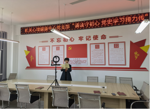 为推进党史学习教育走心走实,创新学习形式, 4月16日上午机关心理健康中心党支部在2B五楼开展“诵读守初心 党史学习接力传”主题党日活动,活动由党支部书记靳潢主持,全体教师参加。