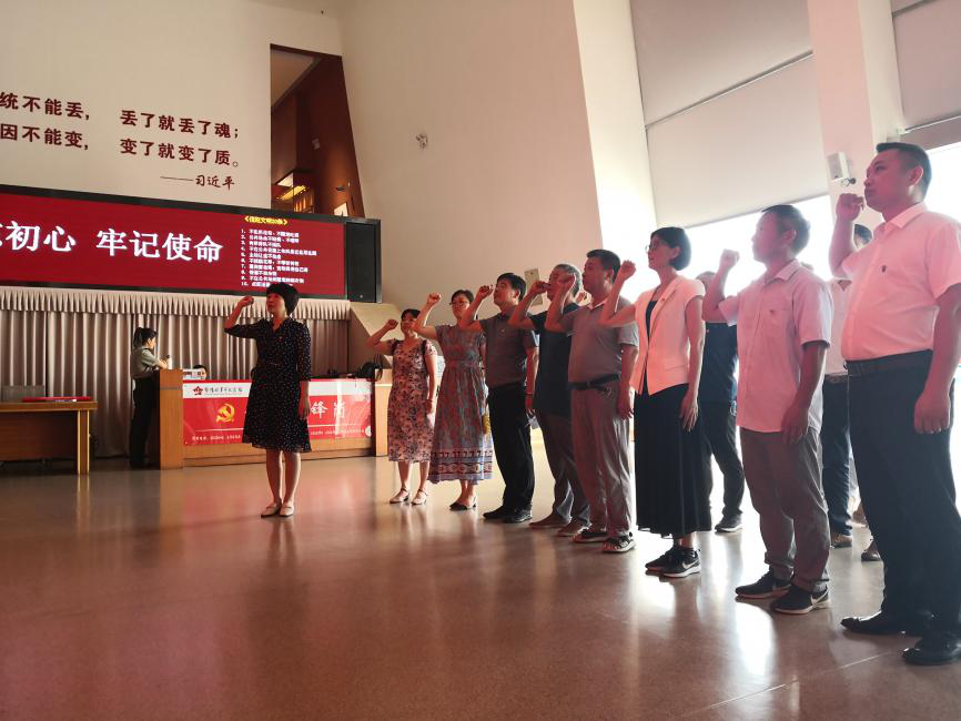 活动分为两个部分,首先全体党员在讲解员的引领下参观了“不忘初心 牢记使命”主题教育展馆。展馆分为“悟初心”、“守初心”、“践初心”三个主题展厅。展厅采用图文展板、实物陈列、场景再现等多种形式,通过一张张生动的历史照片,一篇篇催人泪下的革命史实,一件件珍贵的革命文物,一幕幕艰苦奋斗的生活场景,让在场的各位老师近距离地感受到了革命先烈为新中国解放事业不惧艰难、勇往直前的奉献精神。然后,在纪念馆内鲜红的党旗前,全体党员同志握紧右拳,重温入党誓词。通过重温誓词,各位党员同志感怀了入党初心,坚定了对党的承诺。