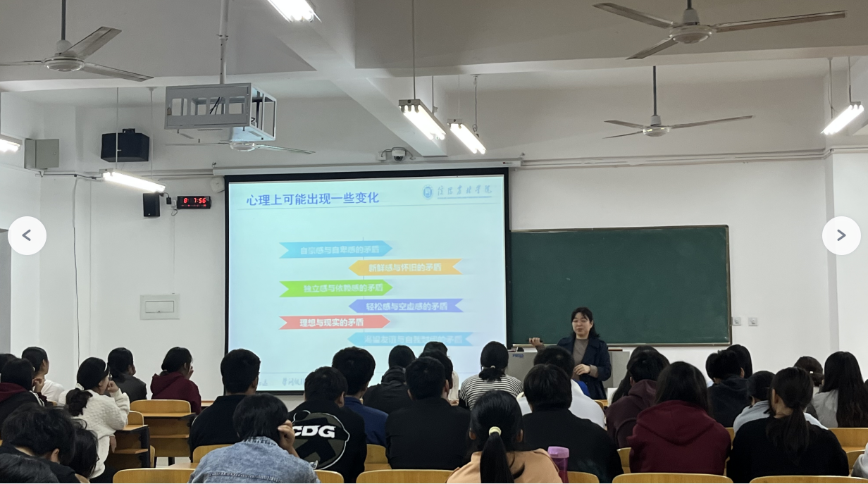 专题讲座“心”准备。中心教师和心理专员面向全体2023级学生先后组织了30余场地新生入学适应心理健康教育专题讲座。老师们从学前“心”期望、入学新挑战两方面分析了入学前的心理预期与入学后现实环境挑战间的差距及可能引发的心理困扰,从生活和学习适应、生涯规划、心理调节等方面提出了建议和意见,激励学生积极迎接挑战,在锻炼提升中适应、在适应中锻炼提升,以崭新的面貌迎接新生活。