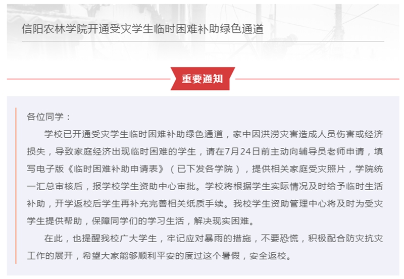 关爱受灾学生,政策措施及时响应。一是精准资助受灾困难学生,党委学工部在第一时间开通受灾学生临时困难补助绿色通道,各学院逐一排查学生受灾情况。全校学生在此次灾情中无伤亡情况,共有195名受灾困难学生获得临时困难补助,资助总金额19.5万元,切实解决学生临时经济困难。二是心理疏导及时跟进,心理健康教育与咨询中心开通心理咨询专线,及时提供心理咨询服务;通过各学院和学生干部等多渠道向学生推送灾情心理疏导文章;组织教师参加“洪灾后的心理援助操作与稳定化技术”线上培训,提升心理服务效能。