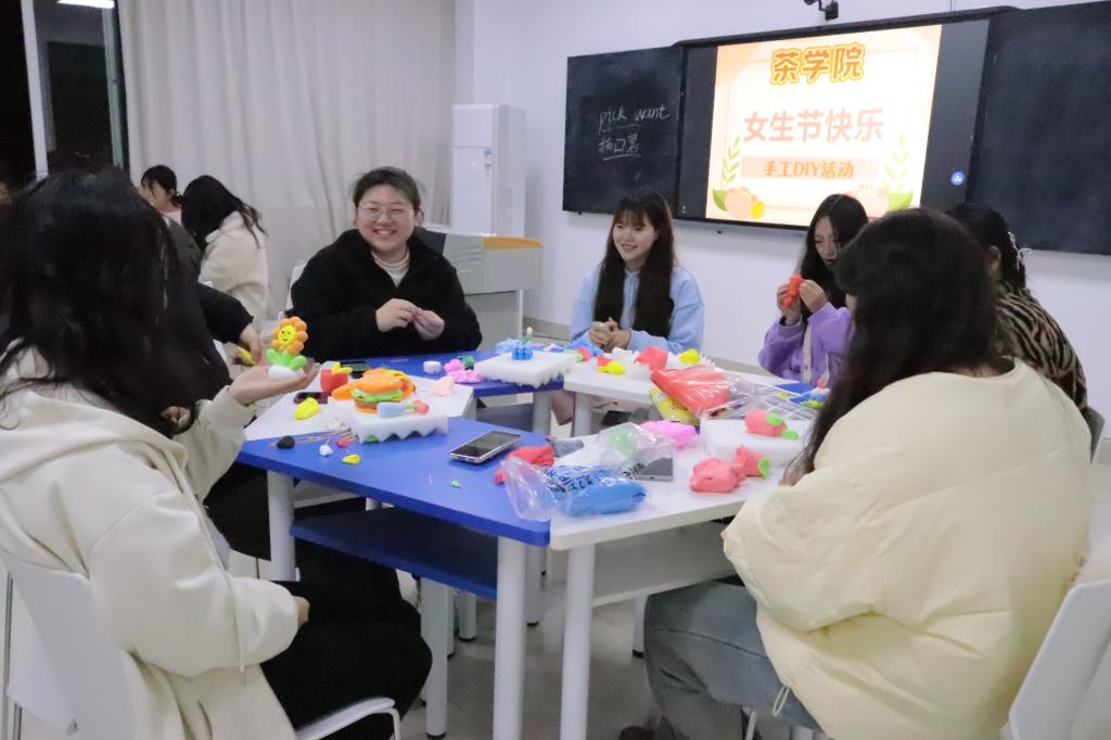 阳春三月,春风送暖,为迎接第114个“三八”国际妇女节的到来,丰富学院女生的精神文化生活,增强学生们的获得感、幸福感和归属感,3月8日于1C503,茶学院团总支心理部、女生部等组织开展了以“巧手绘芳华,幸福信手‘黏’来”为主题的“三八”妇女节创意黏土DIY活动,由梁玉洁老师组织,学生刘璐瑶指导学院22级、23级部分女生开展。