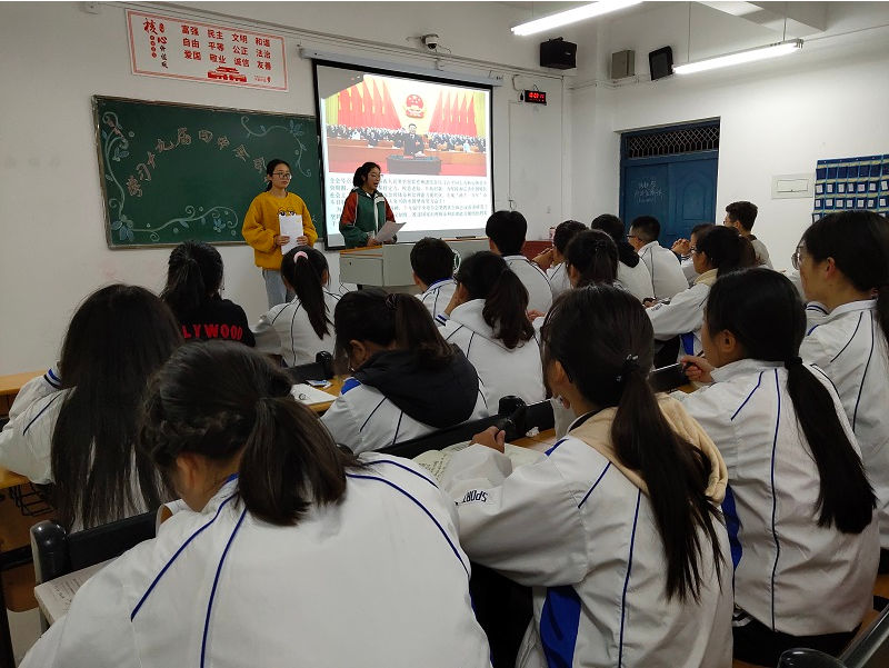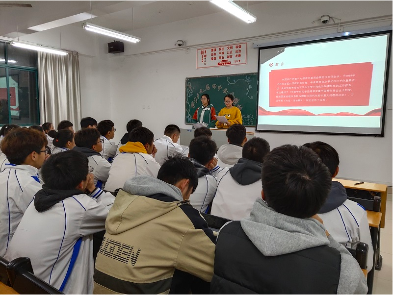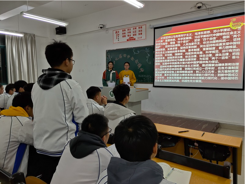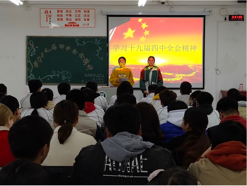 首先,主持人向到场的团员们简要介绍了本次活动的目的及意义,并带领大家学习了习近平总书记在十九届四中全会上的重要讲话。随后,同学们观看了十九届四中全会的相关视频。观看结束后,主持人对“三会两制一课”“两个一百年目标”及本次学习的内容进行了提问,同学们积极踊跃发言。最后,各班团员代表简述各自的心得体会,表示身为信农学子应当坚决拥护党的领导,听党话、跟党走,展现自己的青春风采。