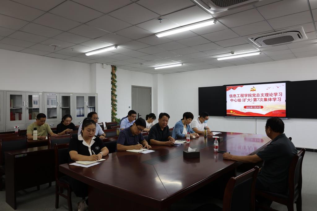 7月29日上午,信息工程学院党总支在双创中心615会议室召开理论学习中心组专项学习(扩大)会议,中心组成员和各党支部书记参加此次学习会,会议由院党总支书记梁其宇主持,校党委副书记、校长邢勇同志到会指导工作。