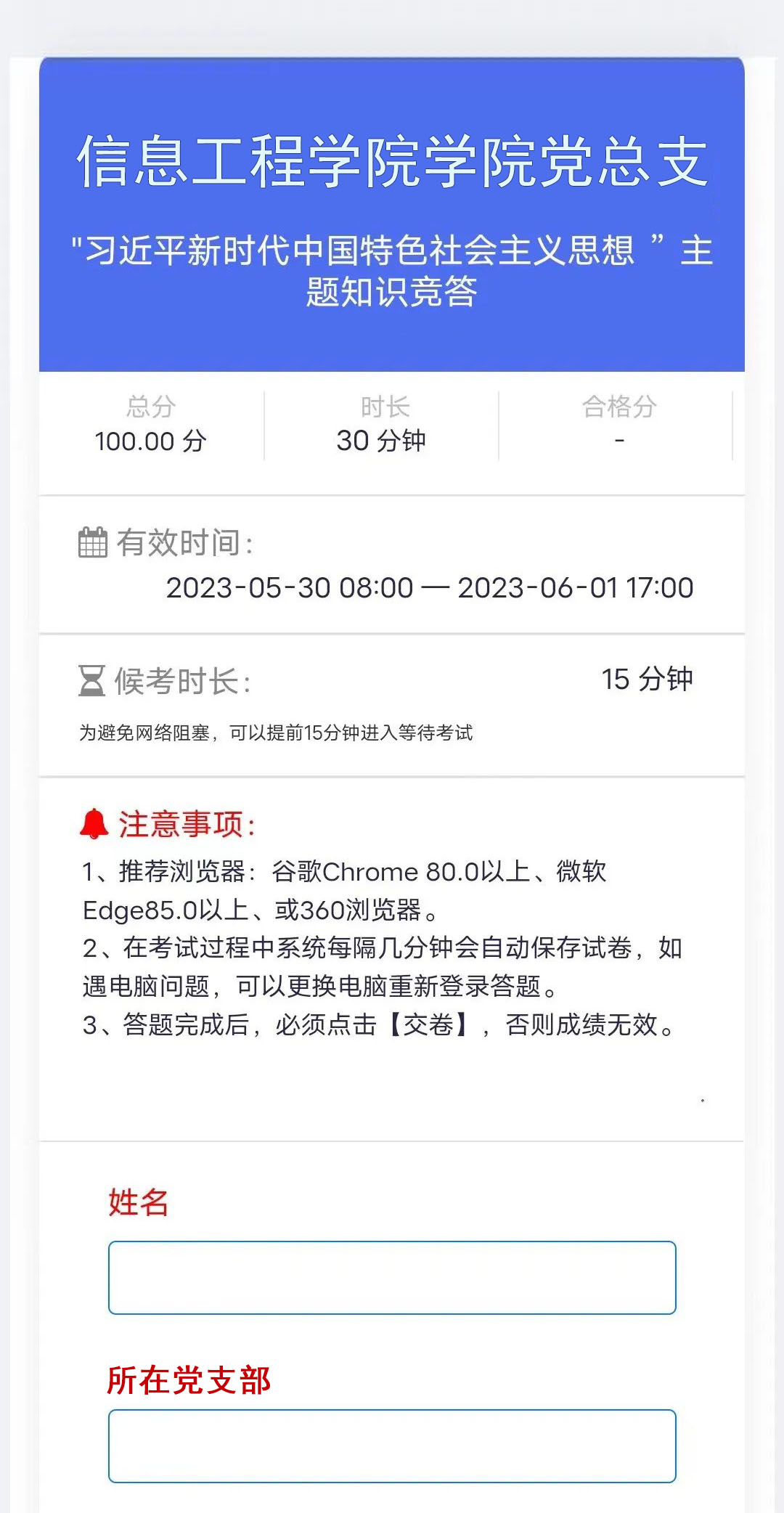 为持续深入推进习近平新时代中国特色社会主义思想主题教育,加强学生的理论学习,提高我院学生的政治素养和综合能力,推动主题教育学习走深走实。信息工程学院党总支于5月30日下午,开展了主题教育线上知识竞答活动,全体学生党员和入党积极分子参与了此次活动。