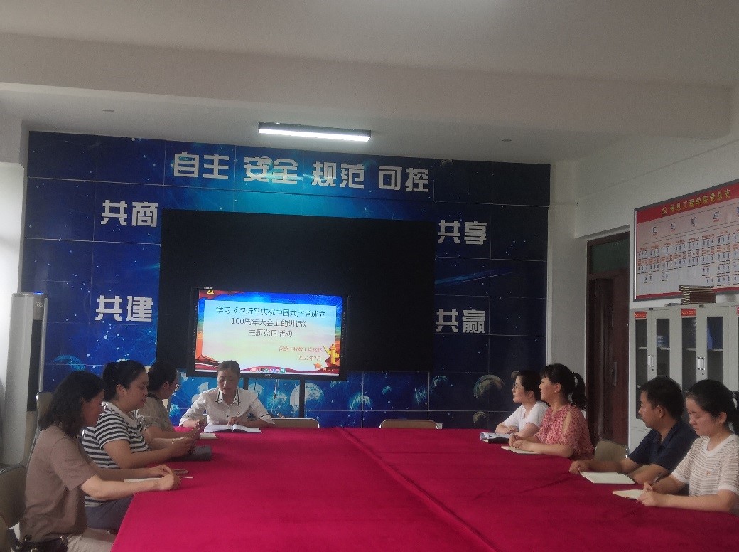 2021年7月2日下午,信息工程学院网络工程教工党支部开展主题党日活动,学习习近平总书记在庆祝中国共产党成立100周年大会上的重要讲话精神。会议由支部书记朱艳平主持。