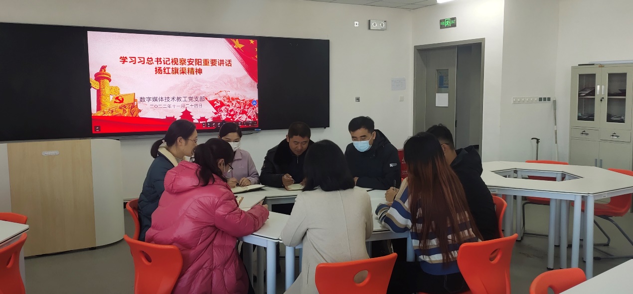 为深入学习贯彻党的二十大精神和习近平总书记视察安阳时的重要讲话精神,11月24日上午,数字媒体技术教工党支部开展“学习习近平总书记视察安阳重要讲话,大力弘扬红旗渠精神”专题组织生活会,以学促思,深刻领会红旗渠精神的丰富内涵和时代价值。会议由支部书记李清玲同志主持。