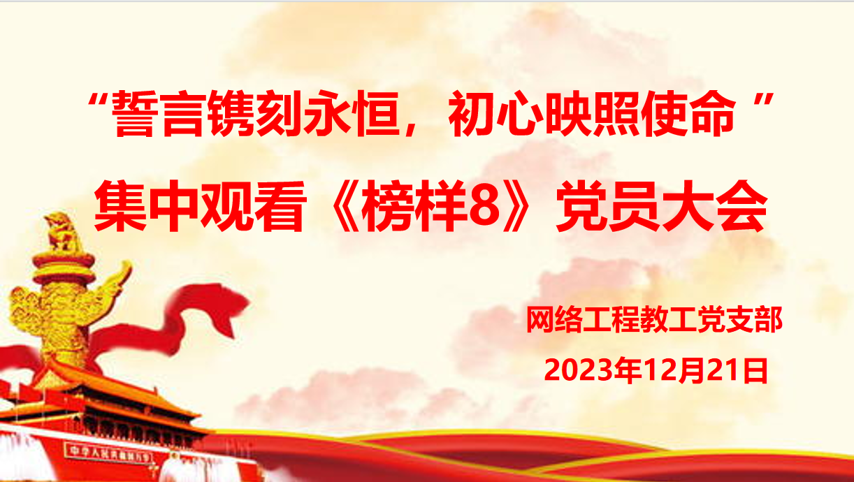 “榜样力量催人奋进,先锋标杆激励前行”。为深入学习贯彻习近平新时代中国特色社会主义思想,持续推动主题教育走深走实,结合上级党组织的安排,12月21日晚8点,网络工程教工党支部召开了一次党员大会,集中观看了中央电视台1套的《榜样8》专题节目。本次会议旨在通过学习先进典型,推动主题教育深入开展。