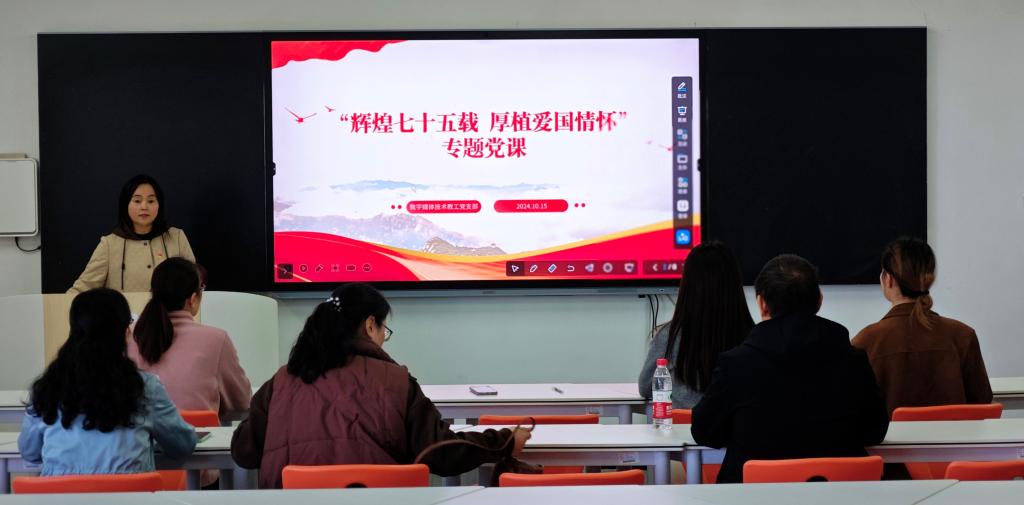10月15日,为深入学习党的二十届三中全会精神,学习贯彻习近平新时代中国特色社会主义思想,在庆祝中华人民共和国成立75周年之际,数字媒体技术教工党支部组织党员开展“弘扬爱国精神 汇聚发展合力”主题党日活动,全体党员参加本次活动。