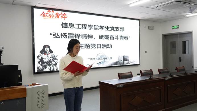 信息工程学院学生党支部于3月19日在双创中心703开展“弘扬雷锋精神,砥砺奋斗青春”主题党日活动。本次活动旨在通过观看影片和研讨交流,领悟雷锋精神内涵,积极发挥党员先锋模范作用。活动由党支部书记姚清源主持,四个学生党支部全体党员参加。