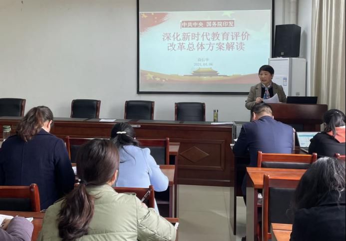 商信华从《总体方案》的背景、目标、总体思路、重点任务等方面作具体传达与学习,并解读文件中的亮点:新时期教育坚持以立德树人为主线,坚持把师德师风作为第一标准,完善教学评价,突出教育教学实效。同时提出可行性建议,一是推进教育评价综合改革,以为党育人、为国育才为根本;二是实事求是,以提高学校治理能力和办学水平为目标;三是破立并举,完善体系,以稳步推进、有效实施为方针。