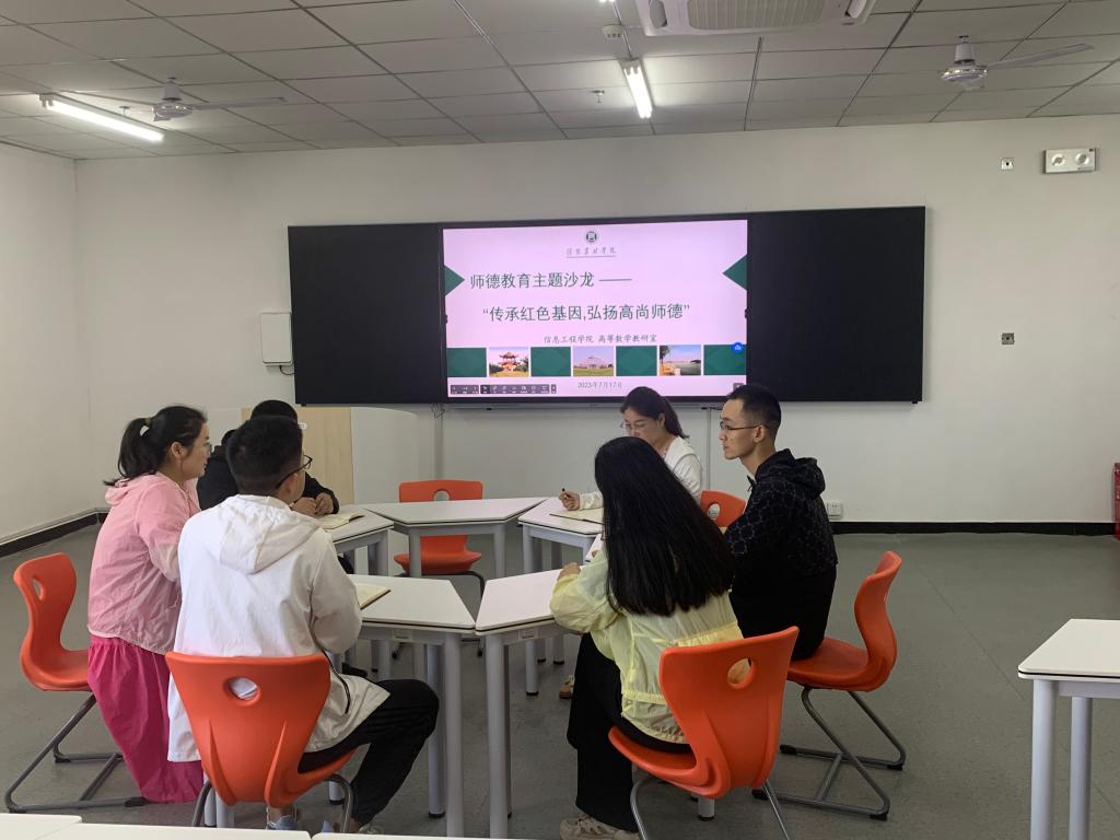 为深入学习贯彻习近平新时代中国特色社会主义思想,贯通学习习近平总书记关于教育的重要论述和指示批示精神,落实学院师德师风学风教育工作,筑牢广大教师为党育人、为国育才初心使命,7月月17日上午,信息工程学院高等数学教研室在双创中心503开展了传承红色基因,弘扬高尚师德”师德教育沙龙活动。