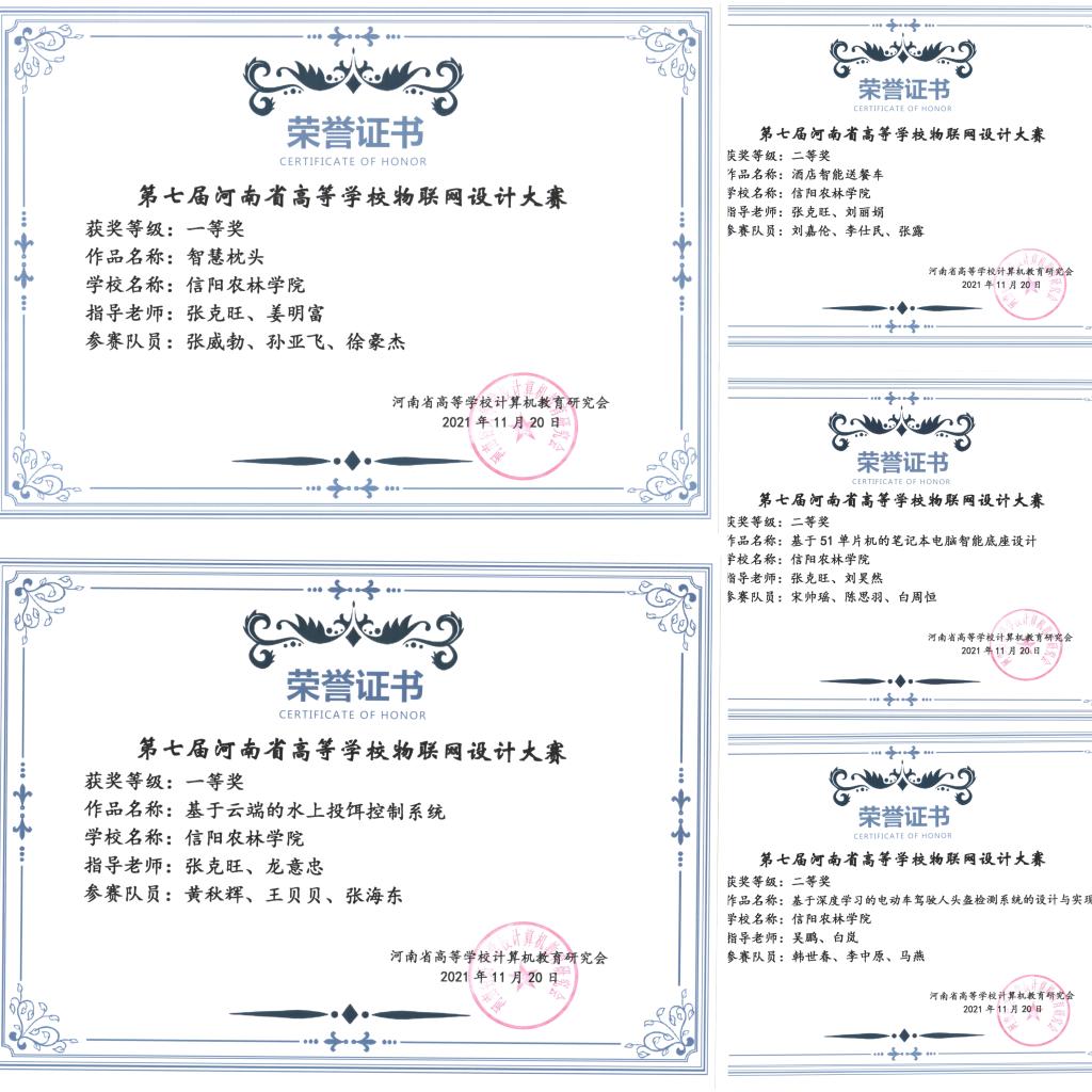 20211122日,由河南省高等学校计算机教育研究会主办、华北水利水电大学承办的第七届河南省物联网设计大赛落下帷幕,我院共有五组队伍参加了比赛,经过激烈的角逐,我院张威博、黄秋辉两组同学荣获一等奖,韩世春、刘嘉伦、宋帅瑶三组同学荣获二等奖。