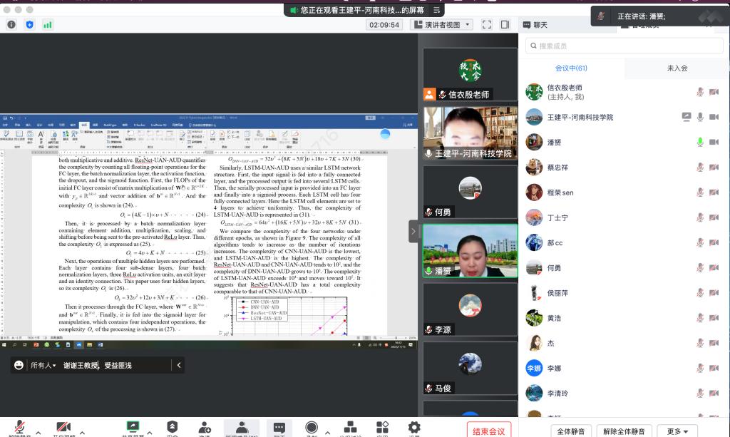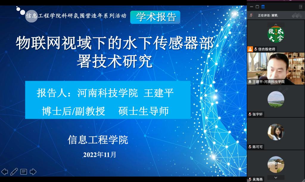 为深入贯彻落实学校科研氛围营造年工作部署,提升学院教师科技创新能力,2022年11月15日下午2点30,信息工程学院邀请河南科技学院信息工程学院王建平博士后副教授为学院做题为“物联网视域下的水下传感器部署技术研究”的学术报告。报告由信息工程学院副院长潘赟主持,学院专业教师和学生参加此次线上报告会。