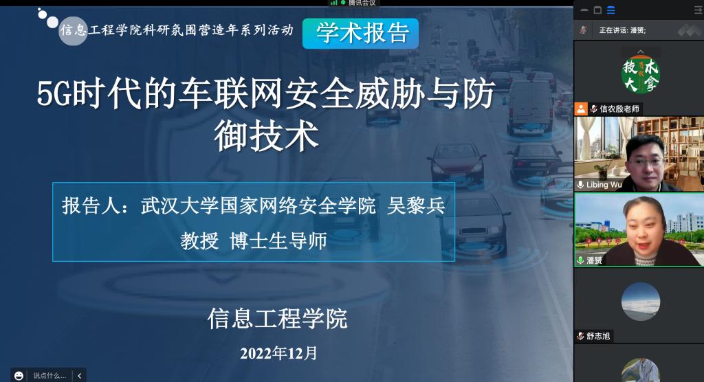 为深入贯彻落实学校科研氛围营造年工作部署,提升学院教师科技创新能力,2022年12月10日下午3点,信息工程学院特别邀请武汉大学国家网络安全学院吴黎兵教授为学院做题为“5G时代的车联网安全威胁与防御技术”的学术报告。报告由信息工程学院副院长潘赟主持,学院专业教师和学生参加此次线上报告会。