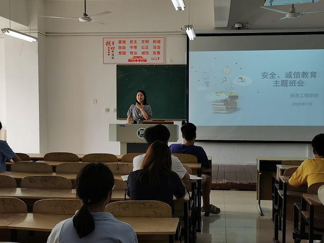 为了严肃考风考纪,强化学生诚信意识,以稳定和积极的心态面对即将到来的专升本考试,2020年7月3日,信息工程学院专科毕业班于二教305、306、307教室召开了诚信教育主题班会,专科毕业班辅导员罗丹、刘旋主持。