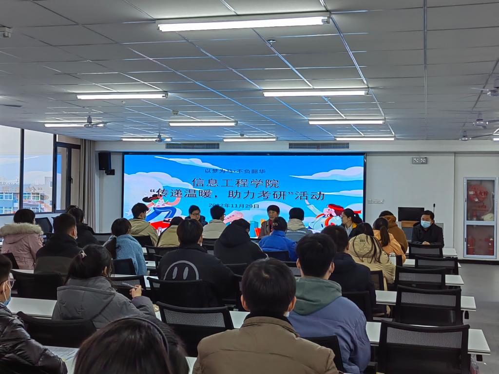 情系考研生,冬日送祝福。为帮助考研学子坚定考研目标,调整应试心态,树立学习信心,11月29日下午,信息工程学院举办了助力考研暖心活动。学院院长商信华、院党总支副书记朱猛、全体毕业班辅导员及考研学生代表参加了本次活动,活动由许华瑾主持。