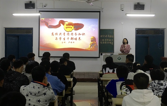 严老师首先向同学们讲述了中国共青团成立至今的发展历程,并指出身为共青团员必须牢记“社会主义青年团是信仰马克思主义的团体”这一概念,时刻谨记中国共产主义青年团(简称共青团)是中国共产党领导的先进青年的群众组织,是广大青年在实践中学习中国特色社会主义和共产主义的学校,是党的助手和后备军。其次,严老师阐明了学生干部的职责与任务,指出班委在完成学习任务的同时应提高个人的思想觉悟和政治意识,以加强班级建设为己任,在团总支的引领下,充分发挥班级团支部及班委的核心领导作用,各尽所能,带动班集体的每一个人争做优秀团员。最后,严老师强调新生在校期间必须遵守校规校纪,不断地加强对《学生工作制度汇编》的学习,做一名合格的大学生。