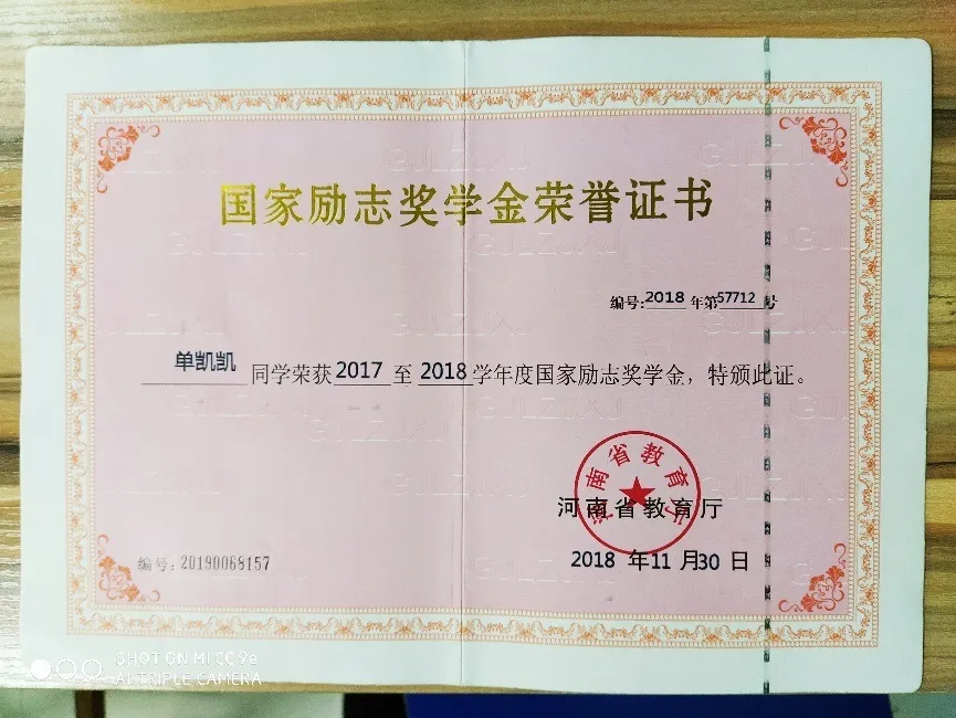 在大学学习期间,单凯凯同学依然保持着高中时早起的习惯,每天清晨5点总能在宿舍楼下看到他早读的身影。在日常学习中,他从不迟到不早退,遇到困惑之处会主动向老师请教。课余时间,他也坚持通过各种方式获取知识,不断夯实专业基础,提高专业技能。功夫不负有心人,他的学习成绩始终在年级名列前茅,并于2018年10月获得国家励志奖学金、校级一等奖学金和单项奖学金。这是对他的努力最好的嘉奖。