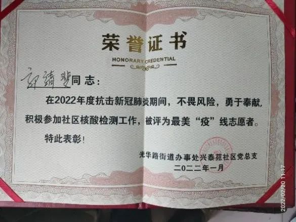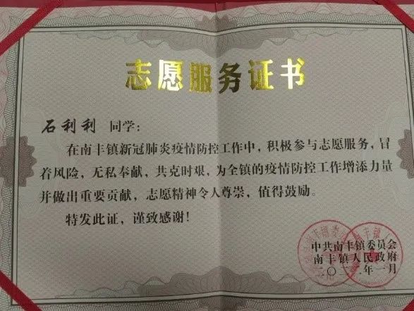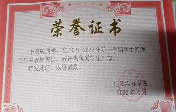 该生思想上积极进取,树立了良好的人生观和道德观;永远保持与时俱进,认真学习党的工作路线,正确贯彻党的方针政策,时刻关注着党和国家的发展形势,以及国内外的局势变化,以党员的标准严格要求自己。在学习上该生勤奋刻苦,始终保持积极向上的学习态度,认真听老师的教学,努力提高自身的专业知识水平,并最终取得良好的成绩。在工作上该生积极的为班级服务,身为班干部,在工作期间始终以服务同学为宗旨,为班级尽心尽力,工作中力求进取,在过去的一年中荣获“优秀学生干部”荣誉称号。在校期间该生积极参加各种活动,在我院举办的“传统文化知识竞赛“中获得二等奖,其中在疫情防控期间积极报名疫情防控志愿者并获得“优秀青年志愿者”称号。