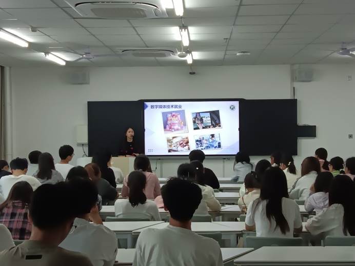 为了帮助数字媒体技术专业新生更好地了解专业发展方向、课程设置及就业前景。9月25日下午,数字媒体技术教研室黄蓉老师在双创505为数媒大一新生开展入学专业教育。黄老师对数字媒体专业的培养目标进行了概述,指出该专业着重培养在计算机视觉设计、图形图像处理、动画影视制作、虚拟现实以及网络多媒体等领域的研究与应用方面的高级专业人才,培养方向融合了科学技术与艺术,充分激发了同学们的专业学习热情。