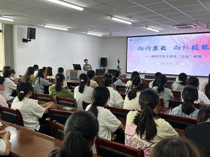 为促进大学生立德修身,进一步提高品德修养,明确“五自”内涵。9月27日,信息工程学院在双创703开展女生“五自”教育。闵洁老师和李越颖老师主讲。闵洁老师为大一新生进行了题为《向内生长 向外绽放》的女生教育讲座。闵洁老师深入浅出地阐述了“五自”内涵,鼓励女生们积极面对挑战,勇敢追求梦想。李越颖老师以《大学女生的自我修养》为主题开展女生教育,围绕自尊、自信、自立、自强、自爱五大主题展开,全方位提升女生的综合素质与自我保护能力。通过生动案例与互动交流,此次活动不仅增强了女生的自我认知与自我保护意识,更为她们的成长之路点亮了一盏明灯。