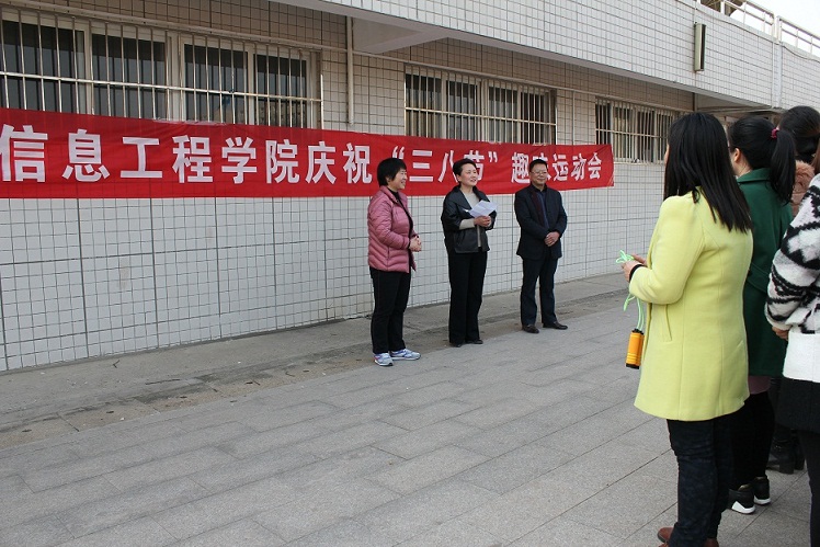 3月1日下午,春风柔和,阳光温暖,为庆祝“三八”国际劳动妇女节,信息工程学院举行了以“活动中享受友谊,运动中享受快乐”为目的趣味运动会活动。校工会副主席杨红霞亲临活动现场,并对本次活动的开展给予肯定和赞扬;院党总支书记胡凤堂做动员讲话,指出本次活动开展的目的和意义。
