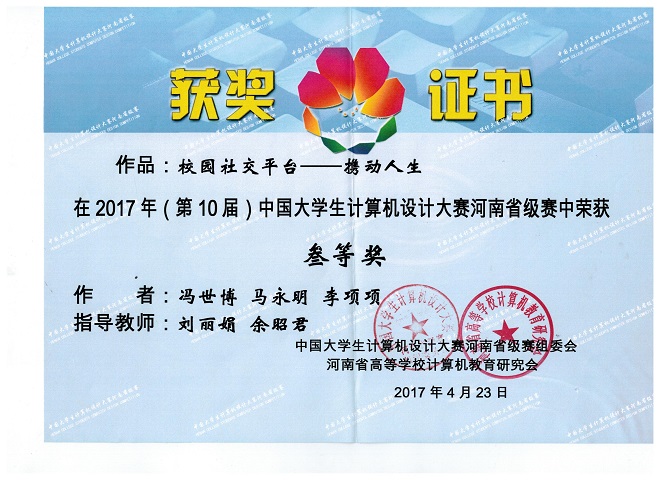 2017年4月21-23日,2017年(第10届)中国大学生计算机设计大赛河南省级赛在郑州大学举行。本次大赛共有全省36所高校的228件作品参赛。信息工程学院刘丽娟、余昭君老师指导冯世博、马永明和李项项作品“校园社交平台----携动人生”,参加本科组软件应用与开发类的比赛。三位学生经过技能测试、作品演示和现场答辩三个环节,最终获得三等奖。