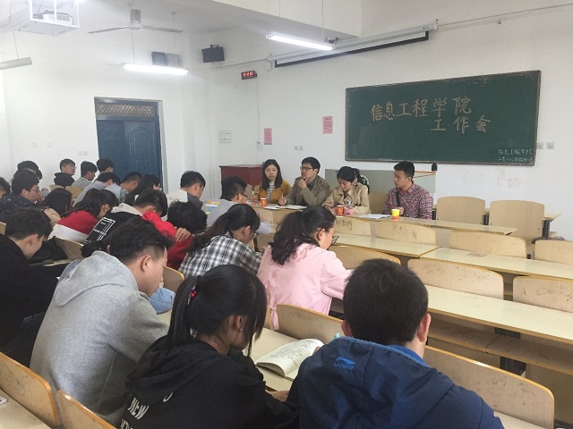 在beat365在线平台官网春季运动会即将来临之际,为进一步增进学生会各部门的协作能力,确保各项工作顺利进行,4月8日下午1点,信息工程学院在二教203召开学生工作会议。学院团支部书记朱猛、17级辅导员、学院学生会主席团、17级各班运动员以及班长团支书参加了会议,会议由院团支部书记朱猛主持。
