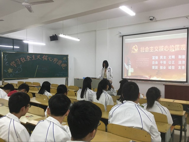 团日活动由班级团支书主持,活动开始时由团支书带领大家进行宣誓,然后由班长做开讲报告,之后,同学们开始讨论和分享自己心中社会主义核心价值观,谈谈自己崇拜和讨厌的历史人物。同学们从对社会主义核心价值观的认识、从身边发生的一些事情,从自我素质的提升等方面讨论如何更好的学习和践行社会主义核心价值观。通过讨论,同学一致认为,应努力把握大学时光,在学习文化专业课的同时,积极参与社会实践、开展校内外志愿活动,不虚度光阴,努力充实自己,不断践行社会主义核心价值观,把学院建设的更好。