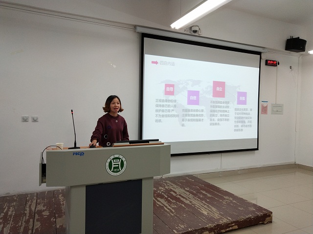 首先,闵老师介绍了什么是“四自”——自尊、自信、自立、自强,以及它们的内涵。自尊要求同学们正视自身的价值,保持人格、维护尊严,不为金钱和权利所诱惑。自信要求同学们克服自卑、依赖的心理,注意发挥自身优势,勇于表现和施展才能。自立意味着要不断提高自身素质,争取主动权,保持经济和精神独立,培养独立自主、自强不息的坚强意志。自强需要同学们提高文化素质,敢于应对各种挑战,塑造新时代知识女性奋发图强、开拓创新、建功成才的崭新形象。接着,闵老师从五个方面探讨了如何成为符合“四自”标准的新时代女性:一是要认识自我,制定目标;二要重视自己的身体,培养健康的心态;三是提高自身专业技能,增强自身文化修养;四要培养爱好,扬长避短;五要树立正确的价值观、交友观。最后,闵老师对全体女生提出自己的期望,希望她们能够尊重自己,珍爱青春,自强自立,奋发有为,在大学四年的学习生活中为自己谱写无悔的青春!
