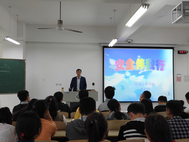 为了构建和谐的校园环境,增强2018级新生的安全意识,提高学生的自我保护能力,9月26日上午,信息工程学院在二教207、307教室举办了面向2018级新生的大学校园安全教育讲座。本次讲座由信息工程学院副院长李友国主讲,学院2018级全体新生参加。