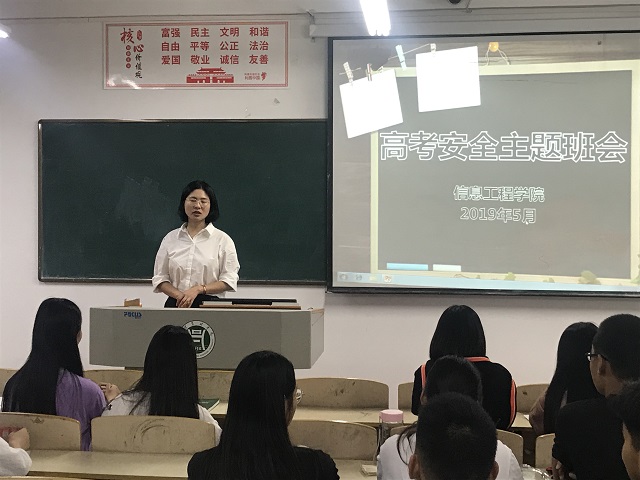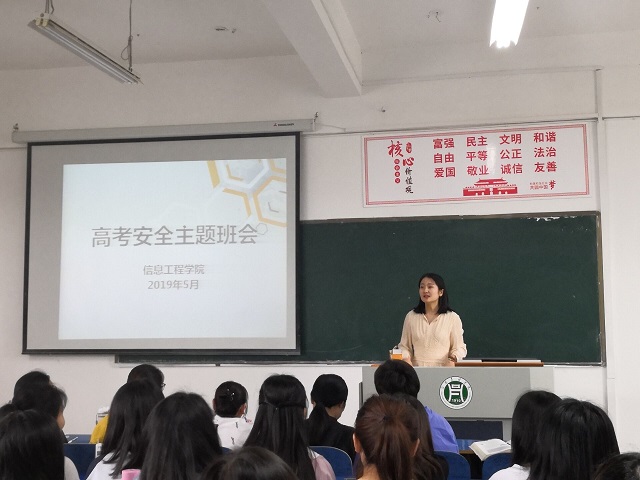 2019年5月27日-31日,学院各班辅导员召开了高考安全主题班会,告诫学生遵守高考期间的纪律,严禁替考,向同学们明确了高考期间安全责任、法律责任等。(信息工程学院 严舒平)