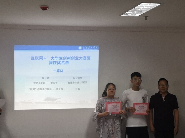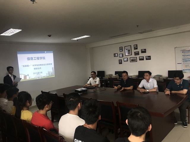 信息工程学院举行第五届互联网+大学生创新创业大赛颁奖活动 为了鼓励同学们积极参与创新创业,展现出自己的创新能力,2019年6月14日于行政楼921进行了第五届创新创业大赛的颁奖活动。院党总支书记胡凤堂、副院长李友国、教学秘书何勇及部分指导教师参加了此