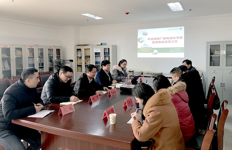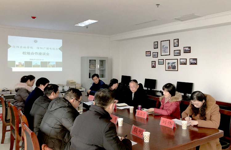 2020年12月21日上午,信阳广播电视台总编室常进主任、大活动部吕晓东主任、外宣部王淑君主任、浉河区广电中心陈礼军主任等一行5人应邀来到我院访问交流。学院党总支书记梁其宇、院长商信华、副院长何勇热情接待了来宾,双方在行政楼921进行了座谈。会议由梁书记主持。