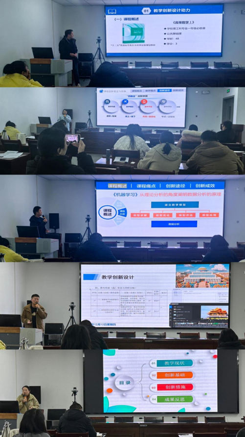此次比赛分为新进教师组、青年组两个组别。参赛选手分别从教学目标、学情分析、问题导向、创新举措、创新效果、课程思政特色、创新成果辐射等多个方面进行教学创新设计汇报。老师们准备充分、精神饱满,深入挖掘课堂教学的痛点和难点,进行了开拓性地设计与创新,巧妙结合线上线下教学优势,充分展示了深厚的教学功底和勇于探索创新的精神风貌。赛后评委肯定了各位教师对课程建设所做的创新举措,教学手段多元灵活,内容丰富多彩,同时也给出了具体的改进方向和改善建议。