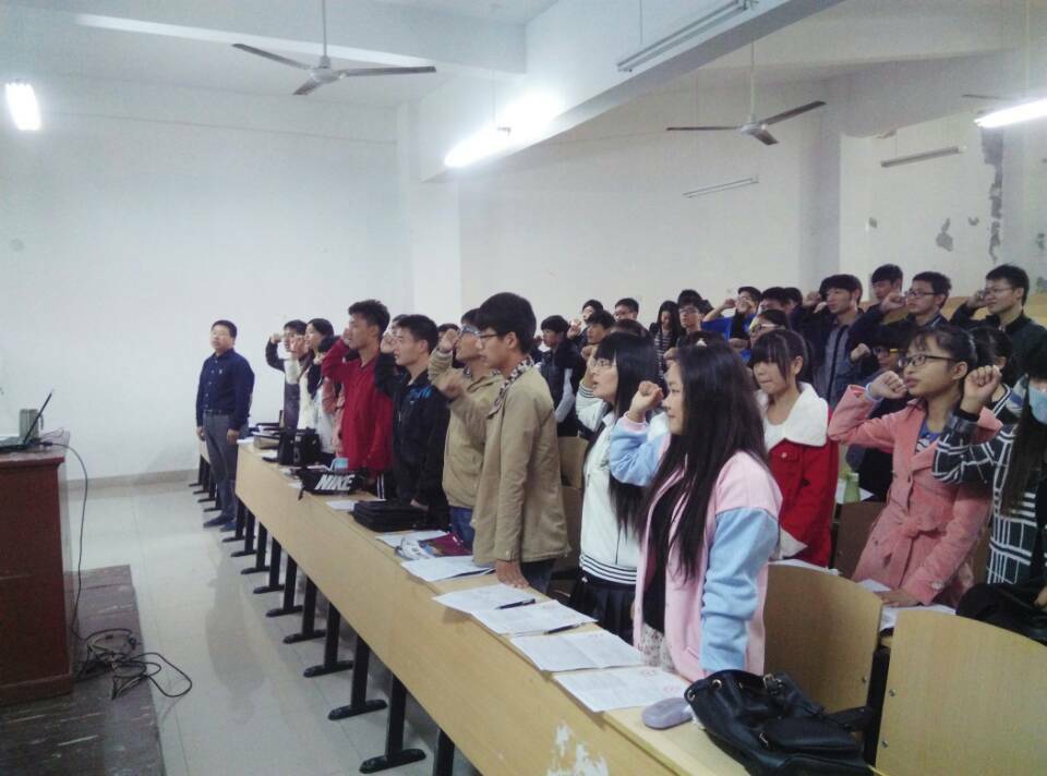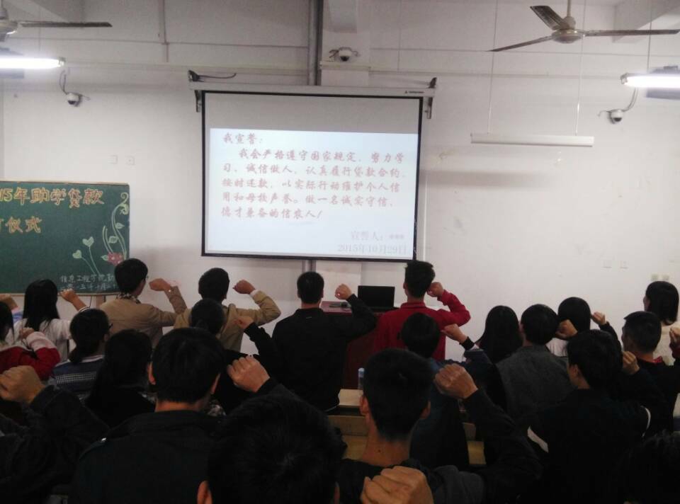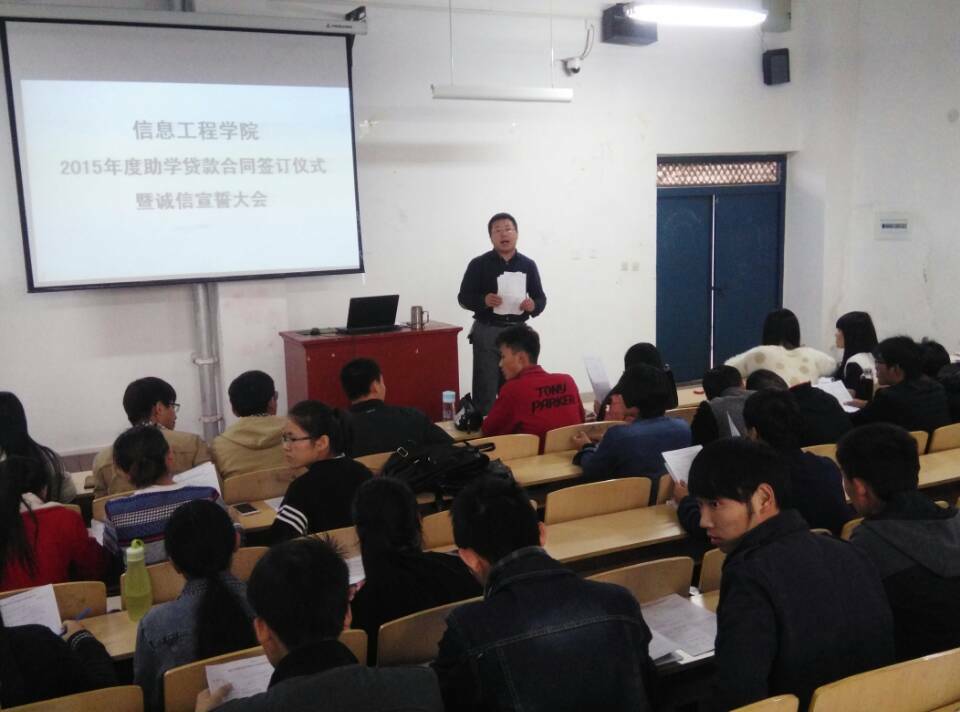 10月29日中午,信息工程学院在二教204教室举行“2015年度国家助学贷款合同签订仪式暨诚信宣誓大会”,信息工程学院贷款专员王同军老师、勤工部主要学生干部和申请2015年度高校国家助学贷款的同学参加了此次大会。