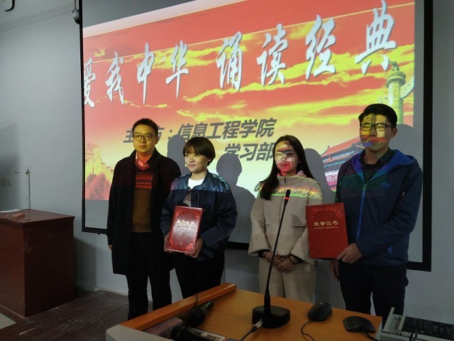 为秉承中华优秀传统文化,感受经典诗文精髓,营造浓郁校园书香氛围,提升师生文化素养,创建良好的校园文化,信息工程学院于11月19日晚19点在二教306开展了以“诵读经典,爱我中华”为主题的朗诵比赛。本次大赛由辅导员严舒平、宋东阳、张睿及部分学生会主席团成员担任此次比赛评委,18级全体同学观看了比赛。
