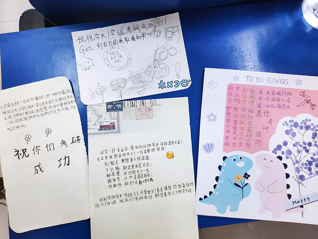 为了不打扰其他同学,一行人悄悄地走进自习教室,同学们见老师和学弟学妹来了,也是非常的兴奋。商院长逐一询问了学生的复习进度、心理状态,并嘱咐同学们一定多吃饭、睡好觉,以饱满的精神应对挑战。随后,商院长代表学院,将提前准备好的抱枕——寓意高“枕”无忧,也为学生们暖暖手、打盹的时候可以抱着休息、橙子——寓意“脐”开得胜、心想事“橙”,还有咖啡送给了同学们。同时,学弟学妹们送上了自己亲手绘制的小卡片,写满了对学长学姐的祝福,也代表了上下年级间的传承。学长学姐们也送出了自己的祝愿,表达了对学弟学妹们的勉励和支持。