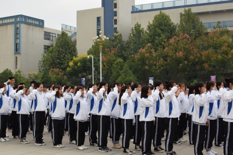 首先,范琼琼带领全体新生回顾了新中国成立70周年以来所取得的伟大成就,并寄语在场学生能够本着求真务实、自立创新的心态,保持积极乐观、蓬勃奋发的精神面貌,用自己的实际行动书写新时代出彩青春的亮丽篇章。在国旗仪仗队同学们铿锵有力的步伐下,鲜艳的五星红旗护送至旗杆处,并随《义勇军进行曲》冉冉升起。这一庄严时刻,在场师生同行注目礼,齐唱中华人民共和国国歌,满怀对祖国崇高的敬意。