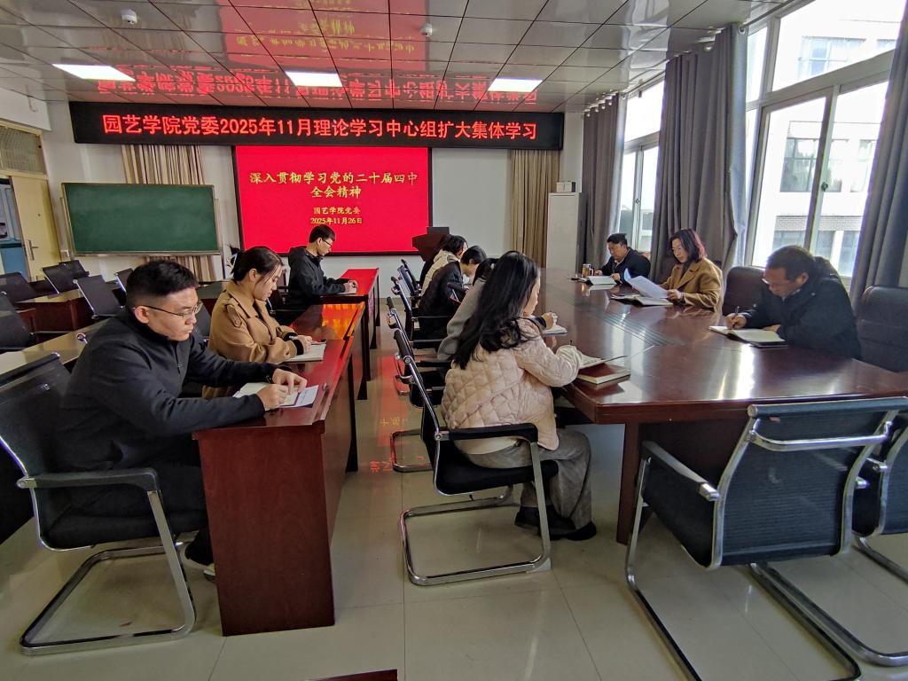 11月26日,园艺学院党委在2A322会议室召开2025年11月理论学习中心组扩大学习会,专题学习党的二十届四中全会精神。院党委书记杜丽主持会议,党委委员参加,支部书记、科级干部列席。
