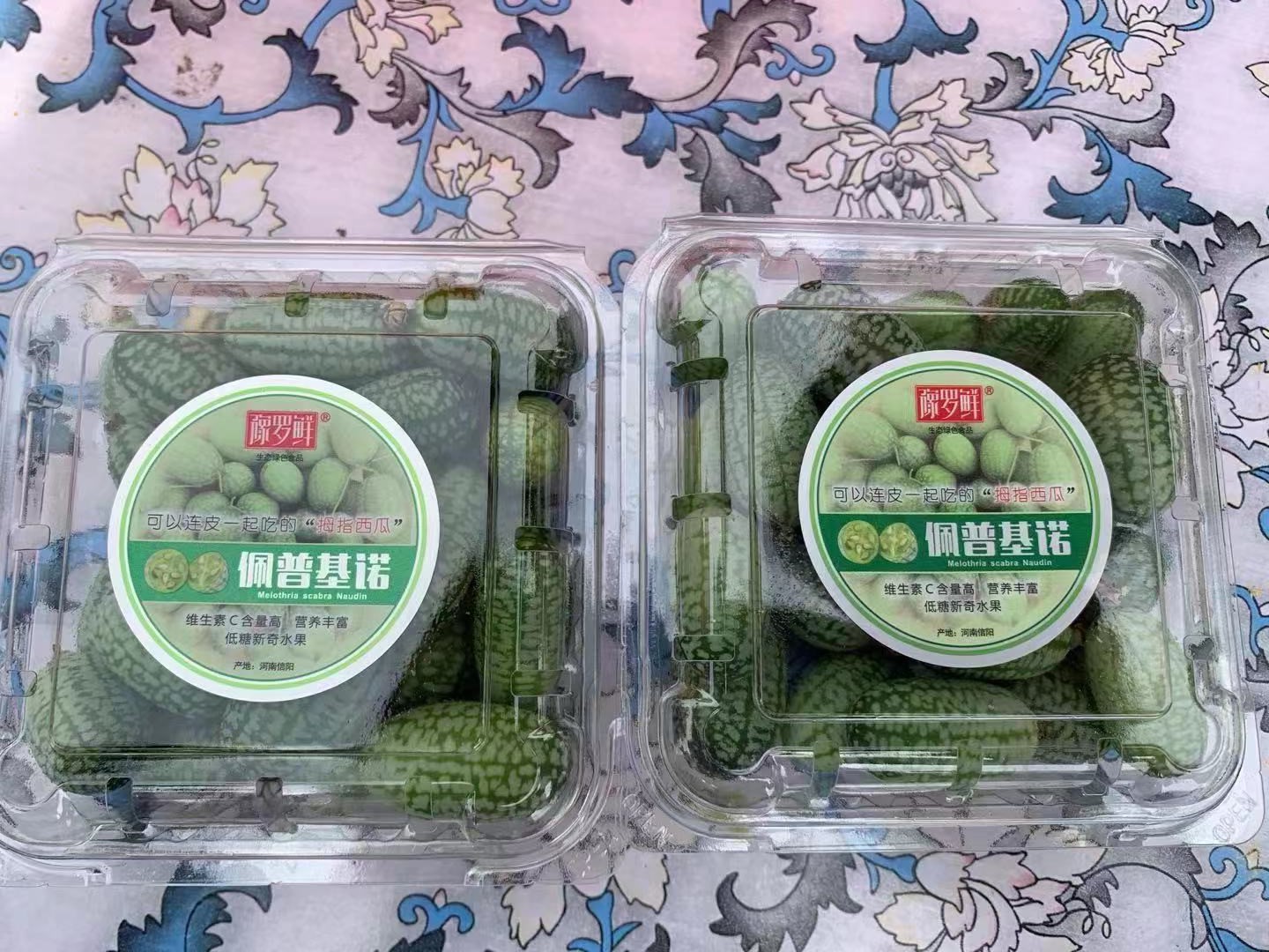 拇指西瓜是来源于美洲的热带水果,果实外观小巧,大小和鸽子蛋相似,成熟后果实长约2.5厘米,单瓜质量5~8克。瓜呈椭圆形,表皮深绿色覆有银绿色条纹,外观像小西瓜,表面光滑无刺,内瓤青绿色,口感独特,有黄瓜的清香,可直接食用。