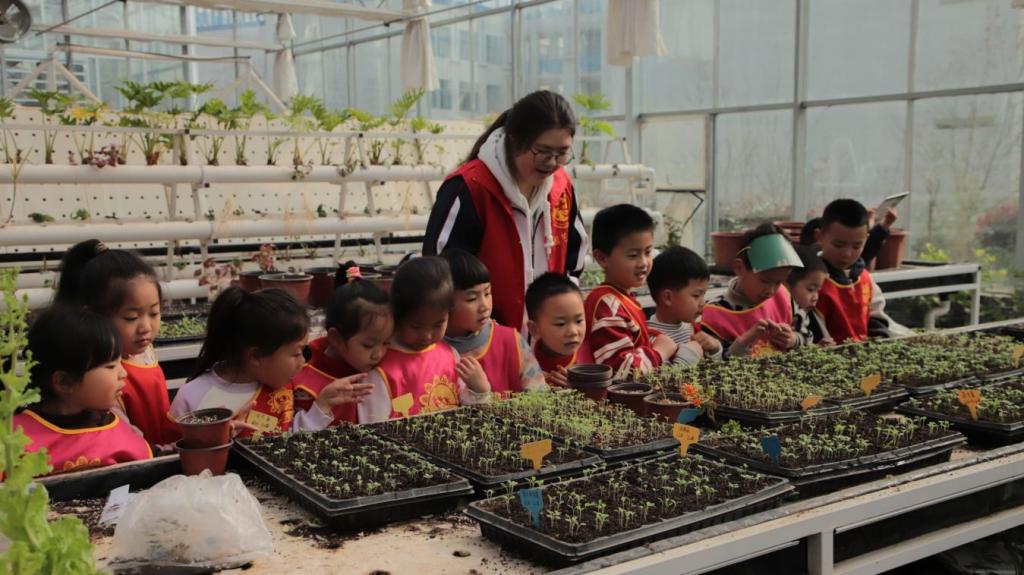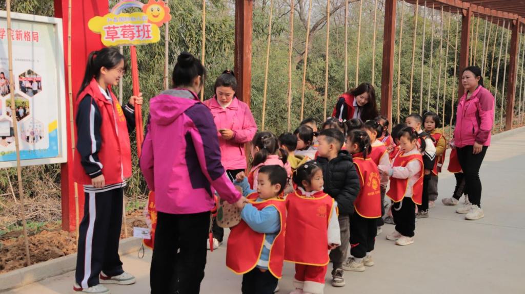 活动在一片期待与热情中拉开帷幕,在学生志愿者的引导和协助下,现场众人纷纷行动起来。师生分工明确,有的挥锹挖穴,有的扶植树苗,有的填土踩实,有的提水浇灌,每个环节规范有序,现场呈现一派热火朝天的劳动景象,处处洋溢着欢声笑语。学生志愿者们带领幼儿园师生参观馨园实验基地的过程中,充分发挥专业优势,为小朋友们悉心讲解各类植物的名称、特点、生长习性等知识。通过志愿者们生动有趣的讲解,小朋友们不仅增长了见识,更在心中种下了热爱自然、探索科学的种子。