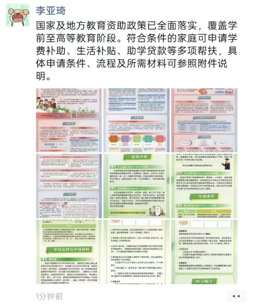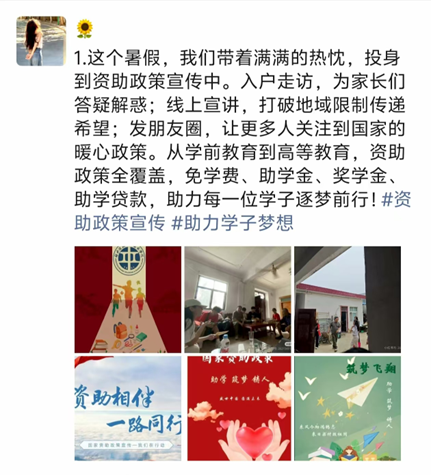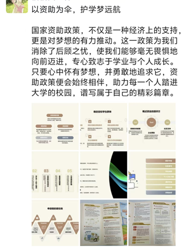 同学们充分发挥“朋友圈”的传播优势,制作政策要点图文,在微信等平台发布,内容涵盖资助政策干货、申请流程图解等。