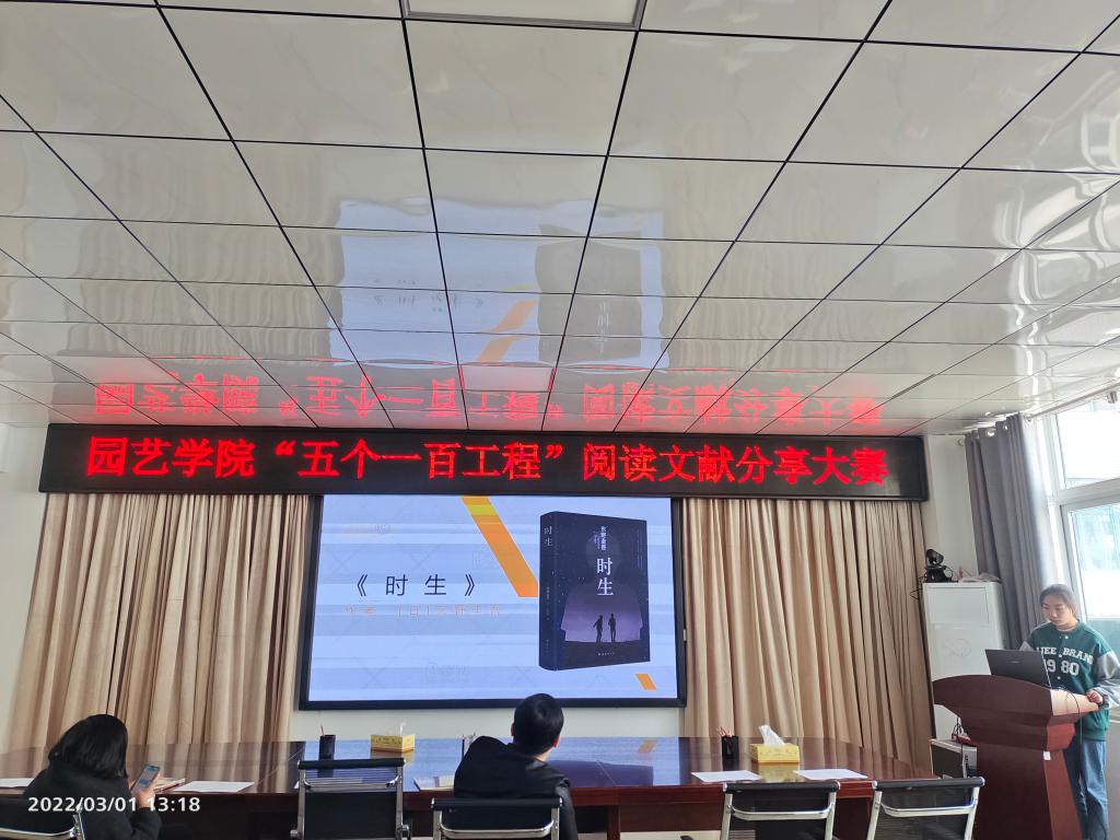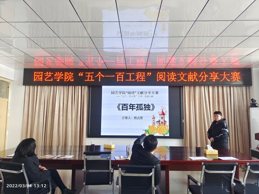 2022年3月1日中午,园艺学院在2A322会议室举办了“五个一百工程”——阅读文献分享大赛,学院党总支书记张祖成、副书记陈丽文、部分辅导员及学生代表参加大赛。